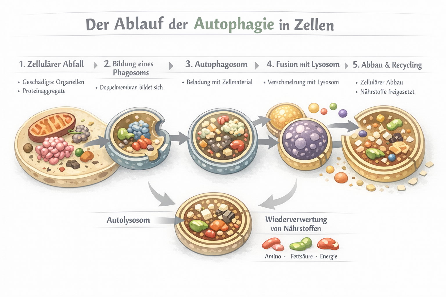 Unsere Zellen besitzen ein kraftvolles Werkzeug um beschädigte Zellteile oder falsch gefaltet Proteine oder weitere nicht brauchbare Materialien zu erkennen, zu zerlegen und zu recyceln. Diese Autophagie ist eine Art Selbstauflösung. Das bezieht sich aber nur auf Zellbestandteile, die die Zelle nicht mehr nutzen kann. Dadurch wird in der Zell wieder Platz und auch neues Baumaterial steht auf effektive und sparsame Weise zur Verfügung.