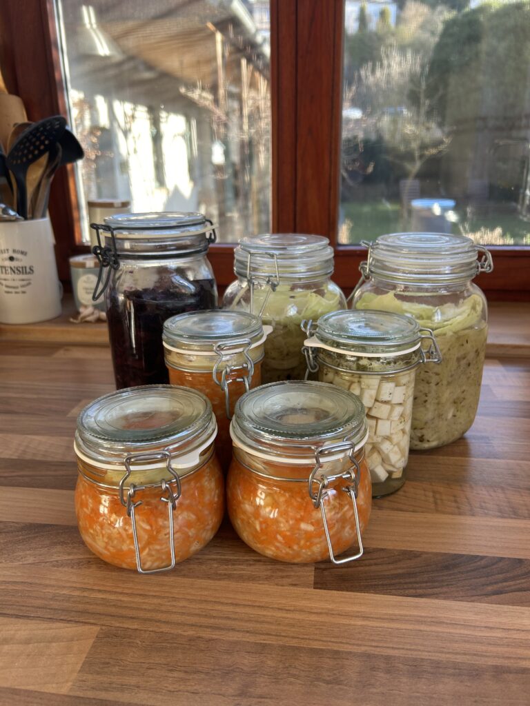 Fermentierte Lebensmittel, wie Joghut, Skyr, Kimchi, Sauerkraut kann man kaufen, aber es ist auch gar nicht so schwer, z.B. Kimchi selbst herzustellen. Kimchi hat dabei den Vorteil, dass es nur zwei Tage gären muss, bevor es gegessen werden kann. Ich habe für dafür verwendet: Chinakohl, Möhren, einen Apfel, Rettich, Ingwer, Knobloch, etwas Chili, etwas Salz. Die Zutaten werden geschnitten oder geraspelt, vermischt mehrfach gestampft und dann ohne Lufteinschluss in ein Glas gefüllt. Die fermentierten Lebensmittel sind lange haltbar, sollten aber ab und zu kontrolliert werde.
